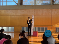 12月10日にトップアスリート交流が行われました。MINAKAMI TOWN.EXEの3名の選手が来てくださり、選手の皆さんの掛け声に合わせて一緒に体を動かしたり、手本を見てドリブルの練習をしたりしました。そのあとは選手たちとミニゲームを行いました。選手に近づいてボールを取ろうとしたり、諦めないでシュートを決めたり、子どもたちも楽しんで体を動かし、交流する姿が見られました。