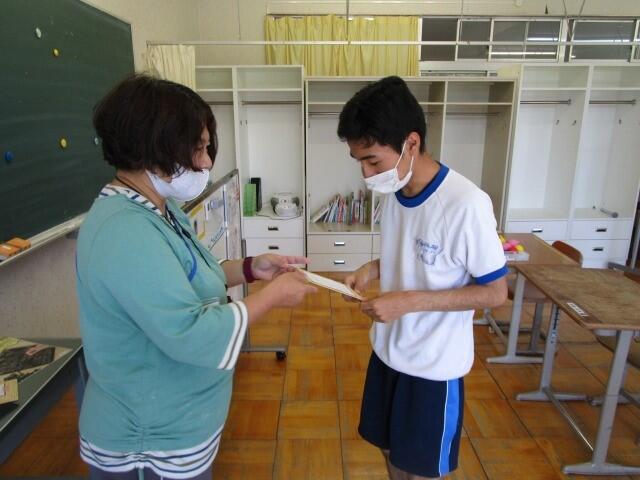 7月11日中学部でALT訪問が行われました。英語の歌を一緒に歌ったり踊ったりして楽しみました。また、最後には、チェルシー先生にお礼として、生徒たちが作った作業製品をプレゼントしました。
