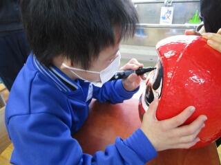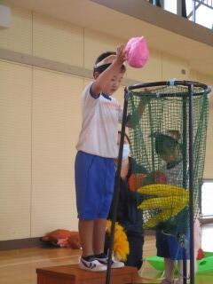 1・2年生がだるまちゃんになりきって、玉入れやコーンバーくぐりなどのサーキット運動を頑張りました。ごほうびの森では、好きなイラストや人形を選んで引っ張ってとることができました。