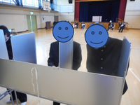 高等部生徒会選挙が行われました。立候補者と応援者が緊張の面持ちで立会演説をしました。それを聞いたほかの生徒は、投票用紙に候補者の名前を記入して投票していました。