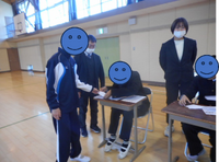 12月10日にトップアスリート交流が行われました。MINAKAMI TOWN.EXEの3名の選手が来てくださり、選手の皆さんの掛け声に合わせて一緒に体を動かしたり、手本を見てドリブルの練習をしたりしました。そのあとは選手たちとミニゲームを行いました。選手に近づいてボールを取ろうとしたり、諦めないでシュートを決めたり、子どもたちも楽しんで体を動かし、交流する姿が見られました。