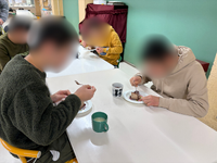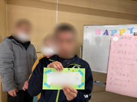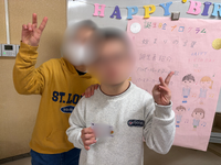 寄宿舎食堂にて誕生会を行いました。誕生者はみんなから歌のプレゼントをもらい、また、各家庭から用意していただいたバースディカードを職員が読み上げると照れながら喜ぶ姿が見られました。自分で選んだケーキも美味しくいただきました。