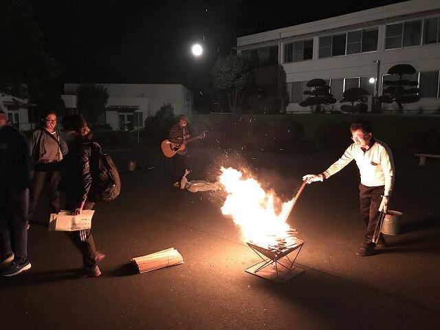 夜はキャンプファイヤーで、たき火を囲み、歌やダンスを楽しみました。